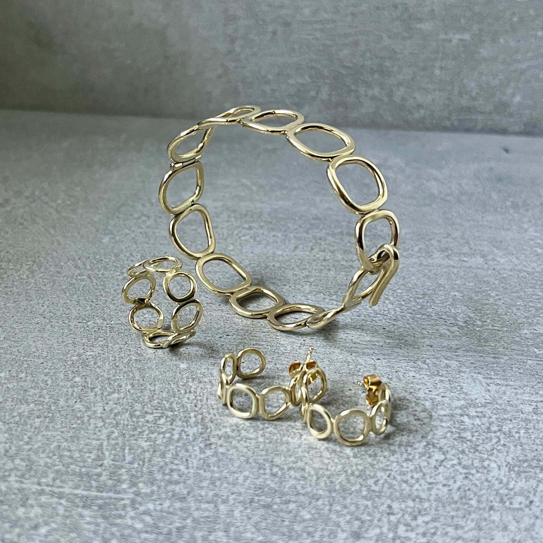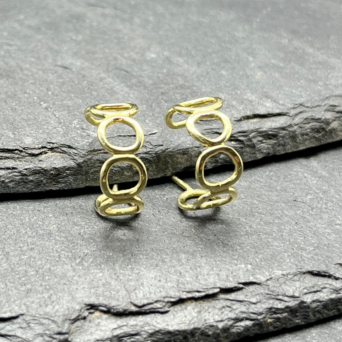Handmade hoops with organic linked elements, each with its own unique rhythm.