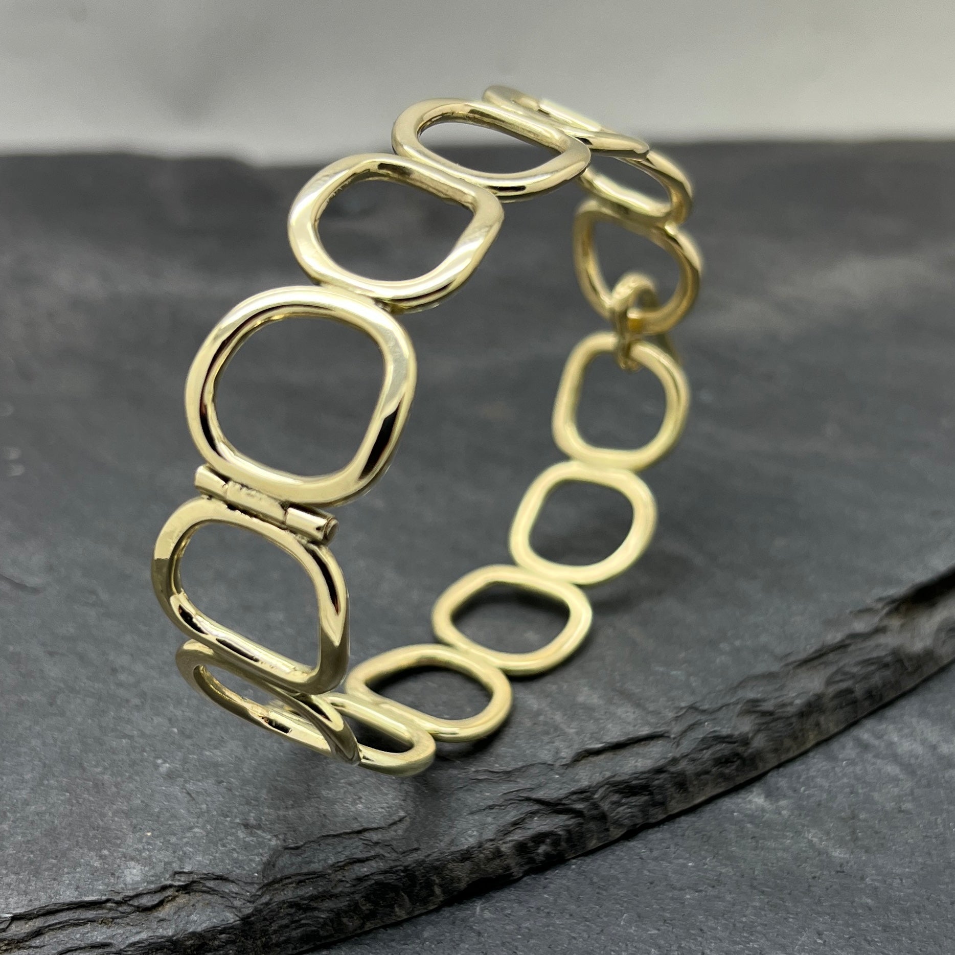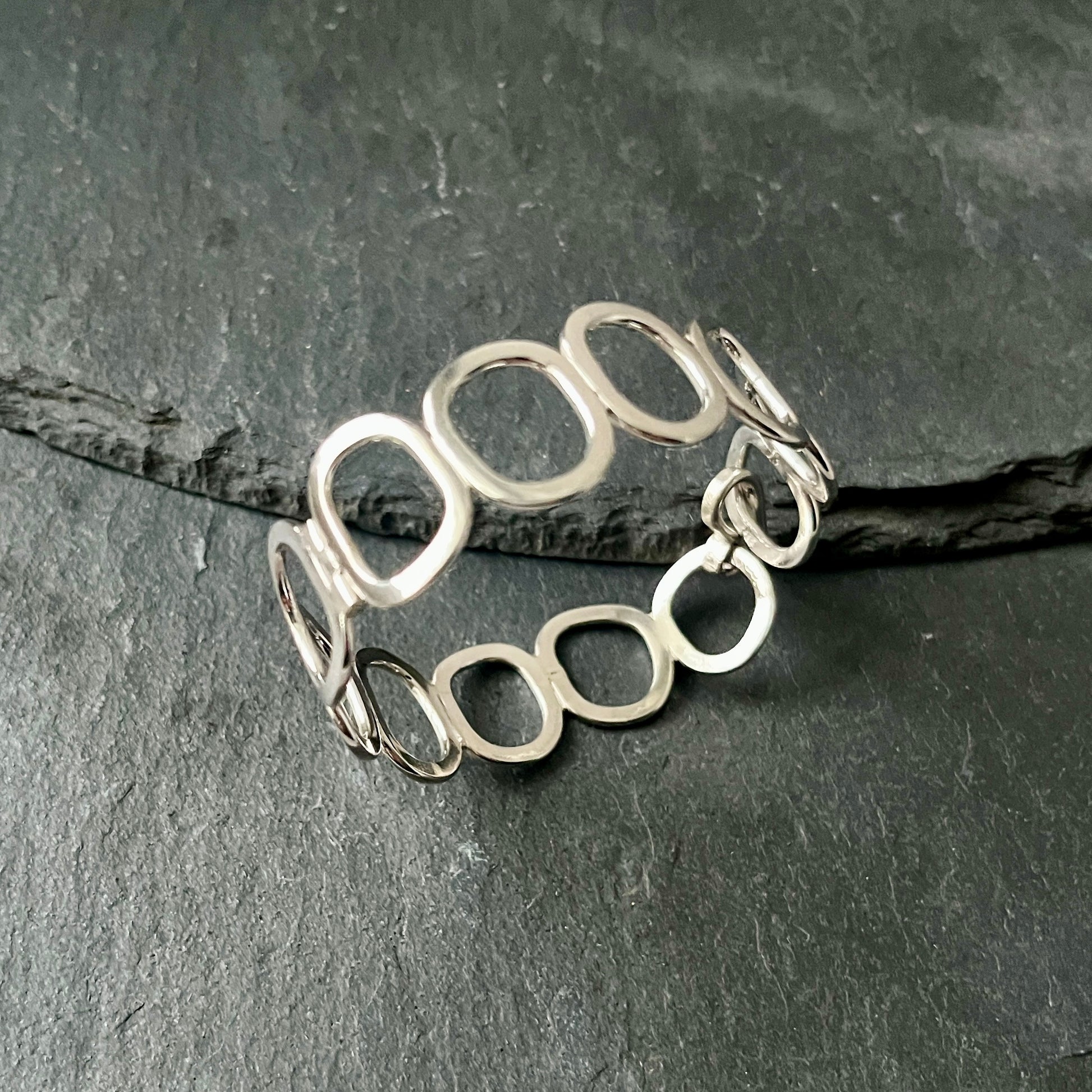 Each link is individually formed and soldered, creating a refined, organic rythm around the wrist. The bracelet has a handmade hook clasp and is approx. 1,5 cm wide.